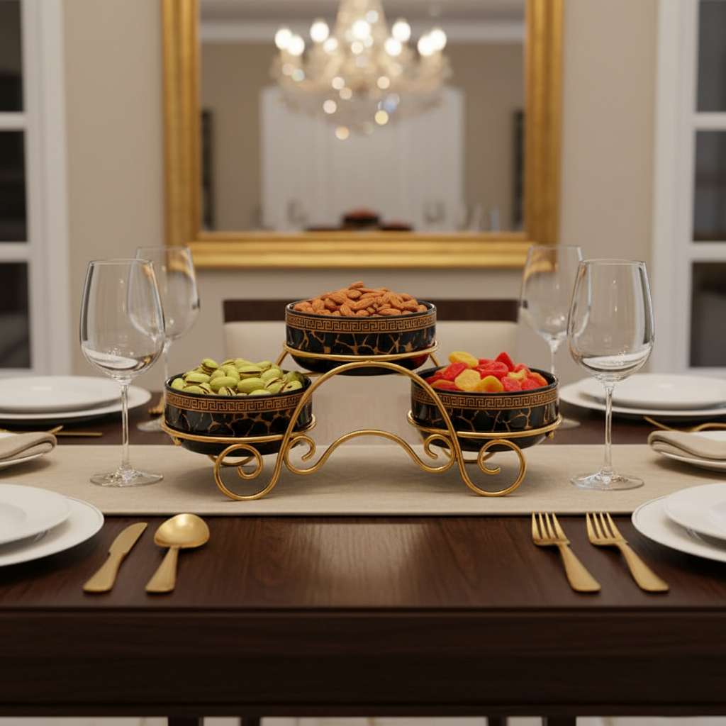 Elevate your dining and serving experience with the Royal Ceramic Jar Trio with Golden Stand. Featuring three glossy ceramic bowls held elegantly on a sturdy golden metal stand, this set blends style and functionality effortlessly. Perfect for serving salads, fruits, snacks, desserts, or side dishes, it turns everyday meals into a refined, curated presentation.